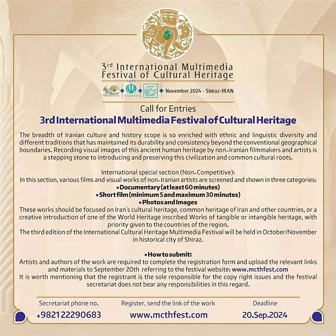 Se informa que la «Tercera Edición del Festival Internacional Multimedia sobre Patrimonio Cultural» tendrá lugar en la provincia de Fars, en la ciudad de Shiraz, durante los meses de octubre y noviembre de 2024. Este prestigioso festival incluirá siete categorías: «Cine, Televisión y Radio», «Obras Digitales Inteligentes», «Artes Escénicas y Performativas», «Fotografía y Carteles», «Ideas y Experiencias», «Campaña de Guardianes del Patrimonio Futuro» y «Revisión de Obras Internacionales».